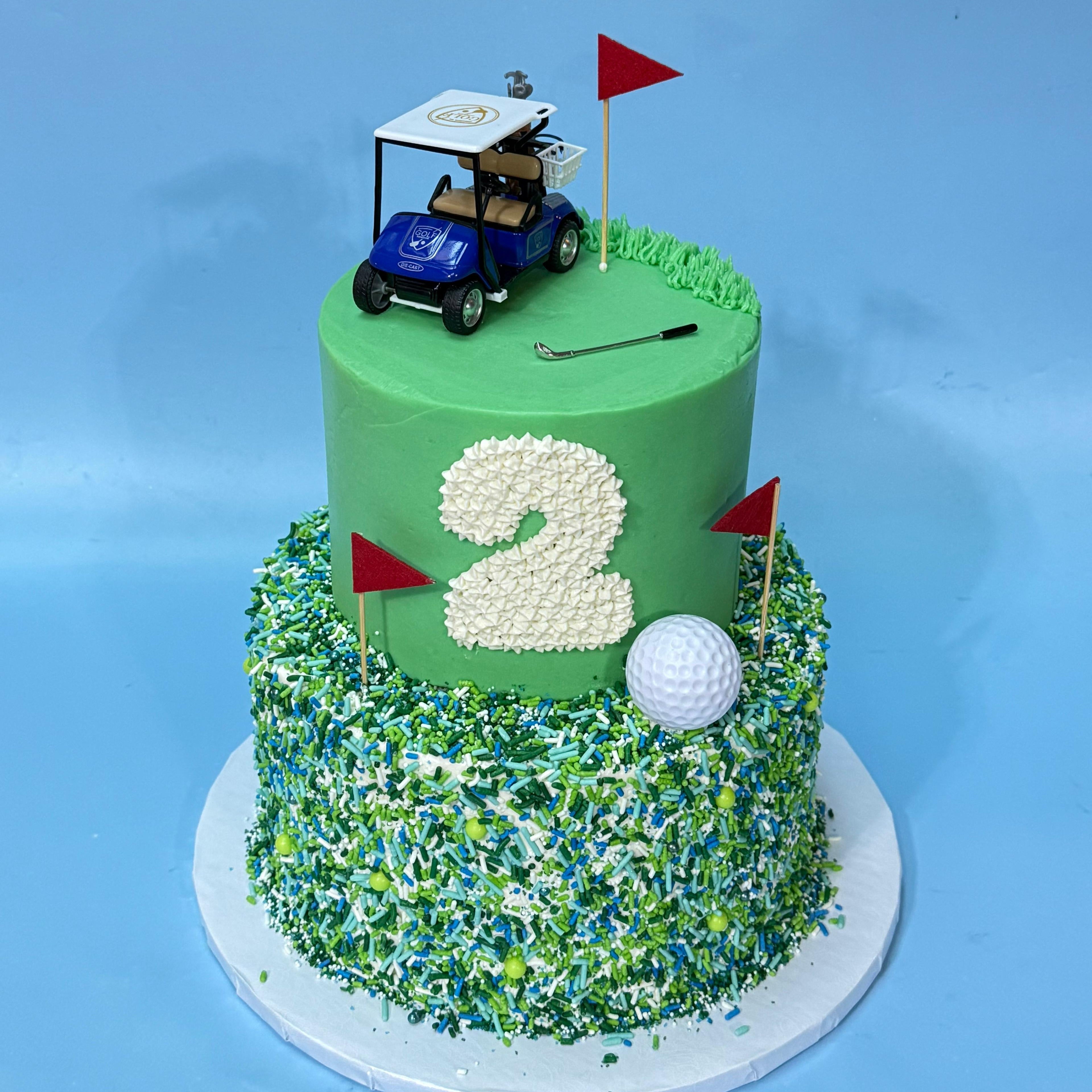 Talk birdie to them with this incredible tiered golf sport cake! Each detail more perfect than the next. Two Tiered of Three layers of your favorite flavor cake between a lighter, airer filling, finished with a vanilla Italian meringue buttercream and golf cake toppers and sprinkles.