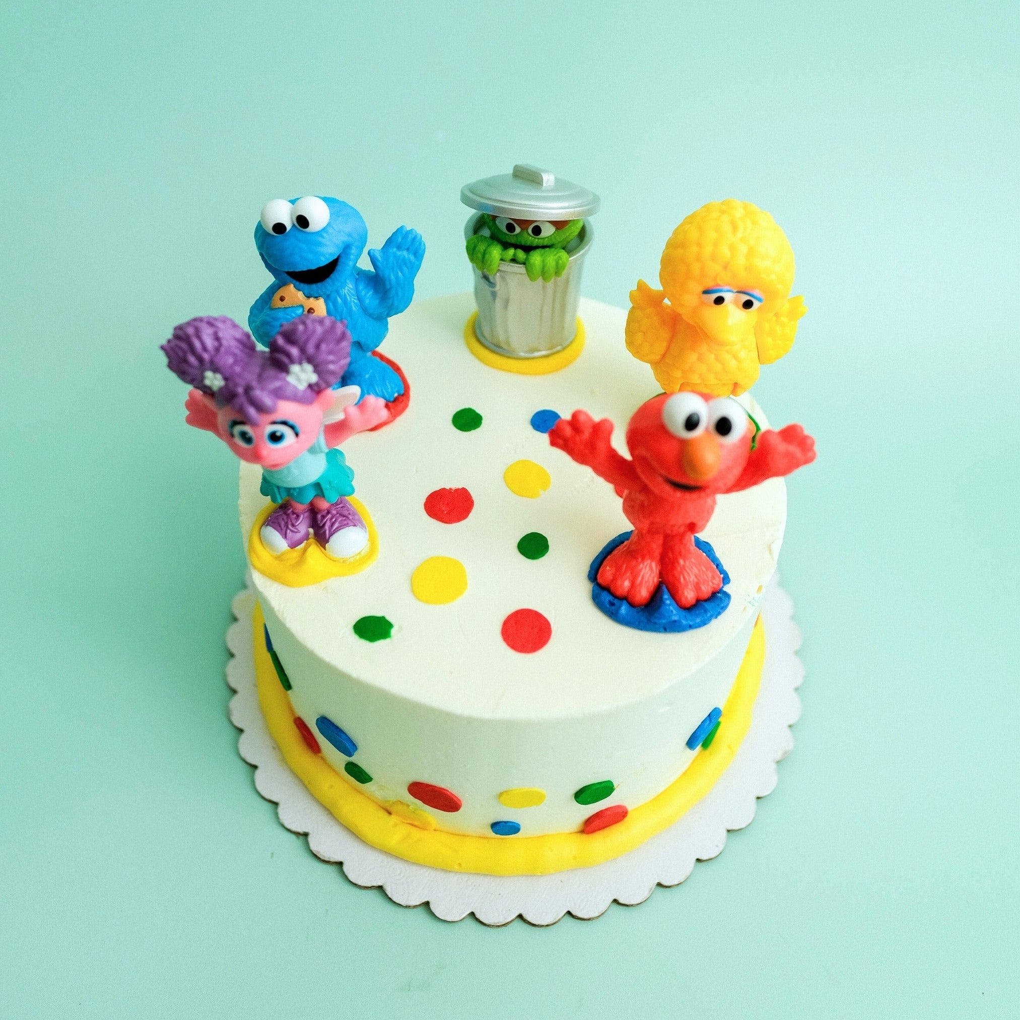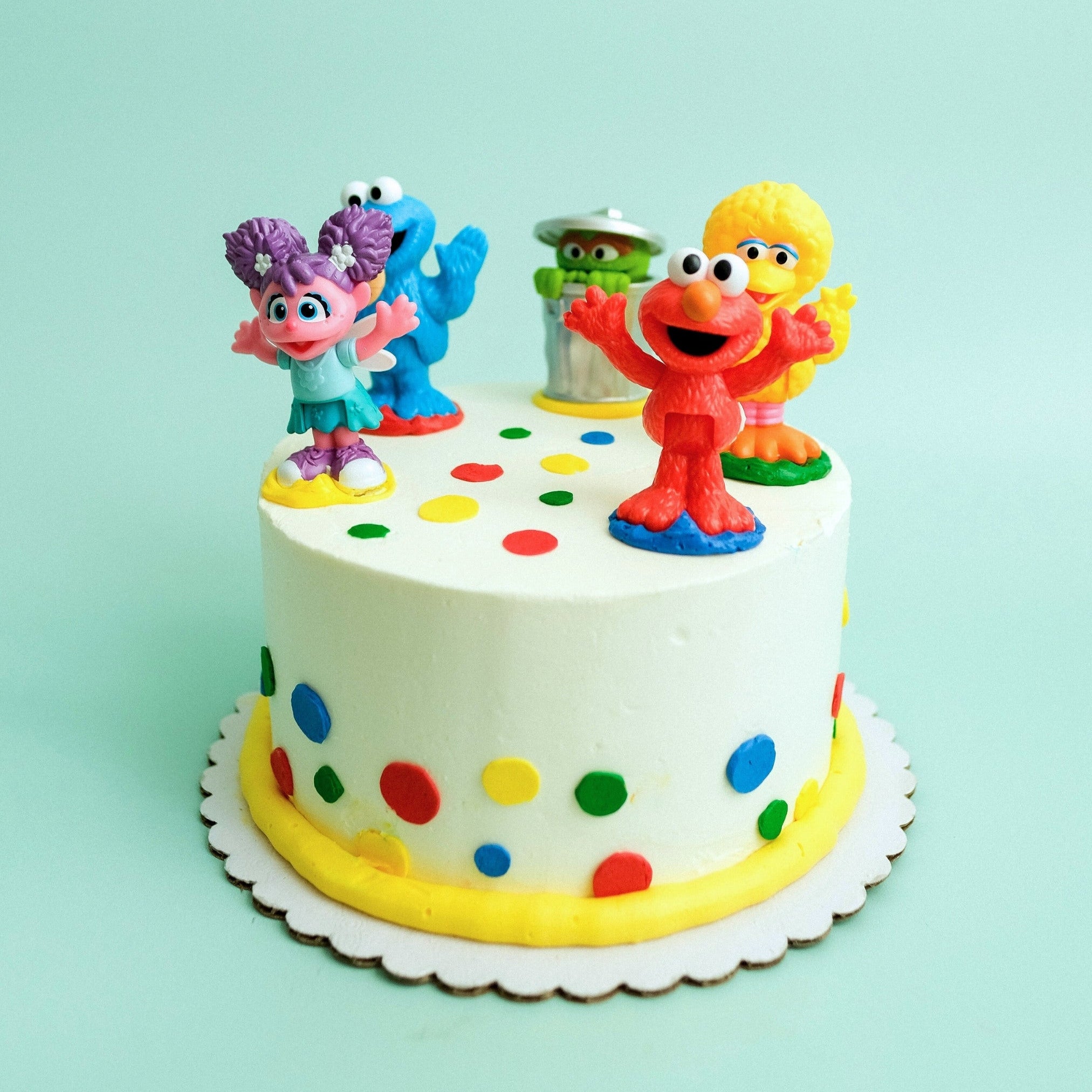 Bring the fun of Sesame Street to the party with this cheerful, crowd-pleasing cake! Finished with smooth vanilla buttercream, colorful confetti dots, and topped with beloved Sesame Street character figurines, this cake is made to spark smiles. Every party is better on Sesame Street.