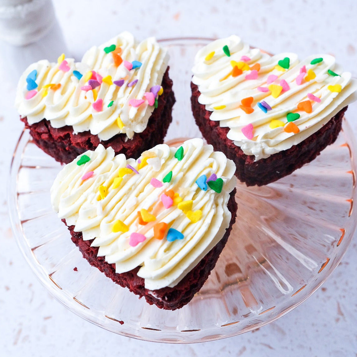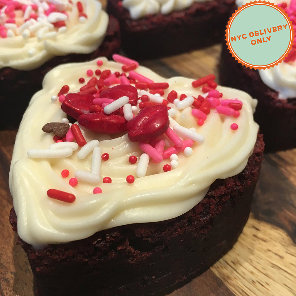Our best-selling limited edition Red Velvet Brownie Hearts topped with cream cheese frosting and sprinkles.